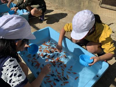 この金魚は、長洲町から贈られたもので、子どもたちは楽しみながら参加しています。