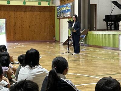 後期始業式がありました。校長先生より「後期は次の学年に向けての準備の期間です。階段と一歩一歩上がるように、毎日積み重ねていきましょう。」と話がありました。また、3年生と6年生の代表者が後期の抱負を堂々と発表しました。
