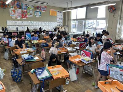 明日から夏休みです。そこで、夏休み前集会を行いました。校長先生や生徒指導担当、養護教諭よりこれまでを振り返った話や夏休みに心がけることなどの話がありました。