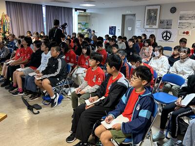 長崎市に到着後、被曝者体験講話を聞きました。真剣に耳を傾け、しっかりメモを取っていました。