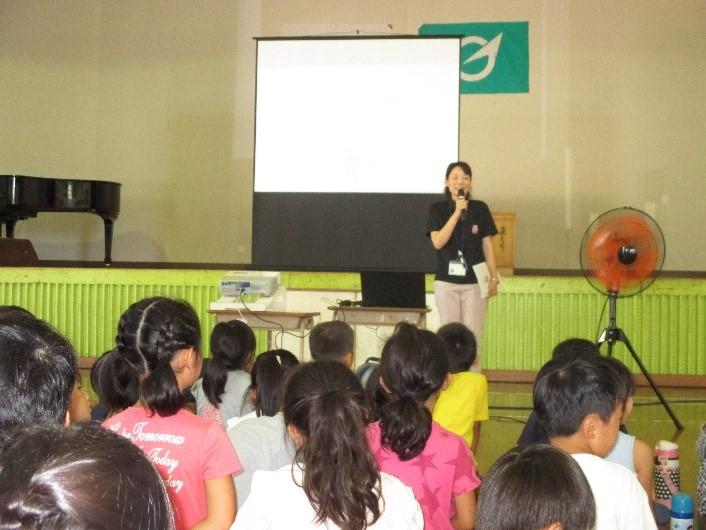 前半は、荒尾市すこやか未来課から栄養士の先生が来校され、「朝ごはんの重要性」の講話がありました。子どもたちへはクイズ、保護者へは簡単な朝食メニューの紹介がありました。