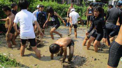 ★5年生が一生懸命作っていた田んぼについに水がたまったので、代掻きをしました。