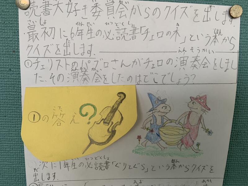 図書室の前には読書大好き委員会さんのクイズが掲示してあります。