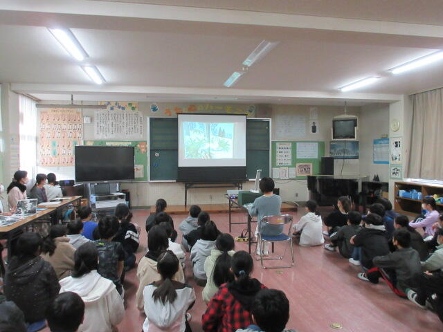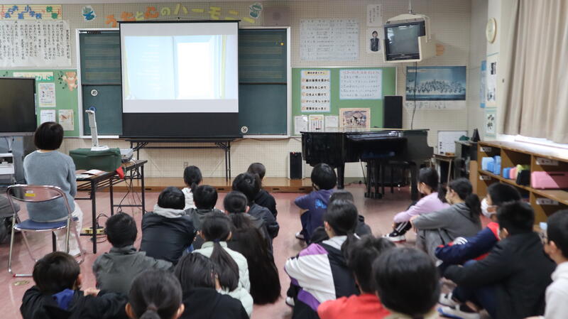 音楽室で行われました。大きな画面に映してあったので、6年生はワクワクしながら読み聞かせを聞いていました。