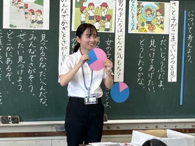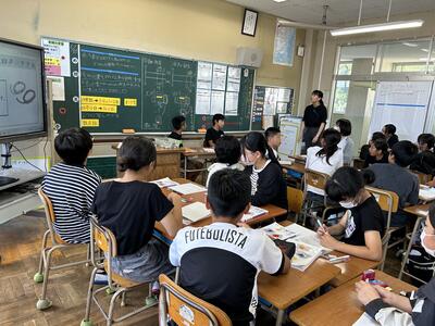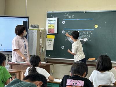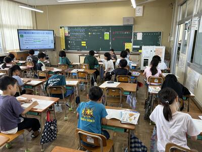 3年1組で算数の研究授業を行いました。「あまりのあるわり算」の導入の場面で、あまりの出し方や答え方に悩みながらも、友達と話し合い、解決していく子どもたちの姿が印象的でした。