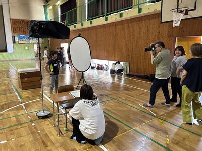 体育館で6年生の卒業アルバム用個人写真撮影が行われていました。子どもたちは決めポーズをして格好よく決めていました。