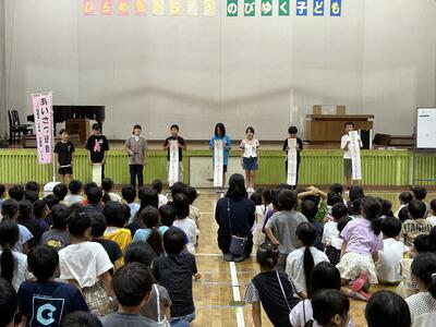 児童集会でハートフル委員会の発表がありました。あいさつのことや人権に関することなど、心をつなぐための取組をみんなに伝えました。
