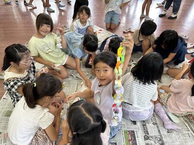 昼休みにお話し大好きの会の企画による「七夕づくり」が行われました。飾りを作ったり、願い事を書いたりしました。