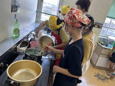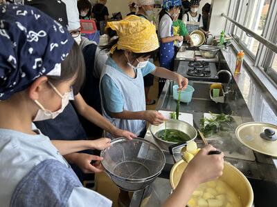 5年生では初めての調理実習が行われています。グループで協力しながら「青菜のお浸し」「ゆでいも」を作り、完食しました。