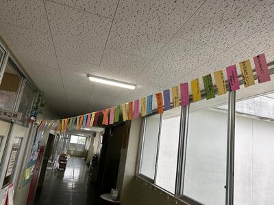 各教室の廊下には、お話大好きの会が作成した七夕短冊が飾られていました。
