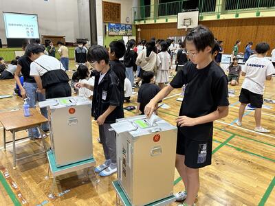 荒尾市選挙管理委員会の方を講師に招き、6年生対象に選挙の出前授業を行いました。選挙権の仕組みや歴史を学び、実際に投票することを通して、選挙の意義を考える機会となりました。