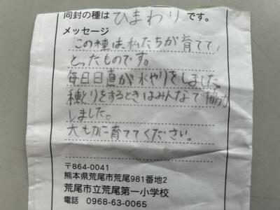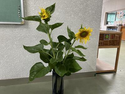 夕方、地域の方がヒマワリを学校に持って来られました。実は昨年の6年生が学校で育てたヒマワリの種を地域の方に配り、ご家庭で大きく育ったヒマワリを持って来られたのです。「つながる」って素晴らしいことだと感じました。