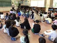 いよいよ全校児童がそろっての新学期がスタートしました。1年生では仲良くなるために貨物列車で楽しんでいます。3年生は、学年集会が行われています。最初の給食はカレーでした。昼休みは先生と一緒に楽しそうです。