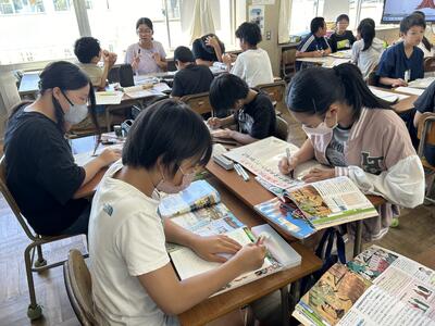 6年生の社会(歴史)では「なぜ、国風文化が生まれたのか」の課題のもと、教科書や資料集をもとにしながら調べ、協働学習で意見を交流しながら考えを深めていました。