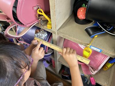 2年生では、30cmものさしを使って、身の回りの物を測る練習をしています。