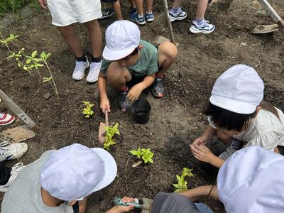 3年生はポット植えしていたホウセンカとオクラを畑に移植しています。理科の学習で観察するようです。