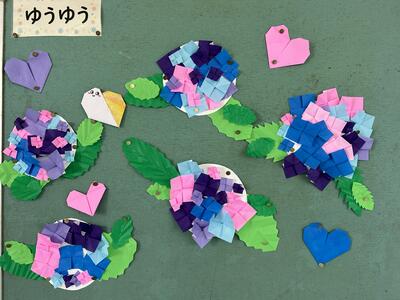 季節を感じる掲示物、アジサイの折り紙上手ですね。