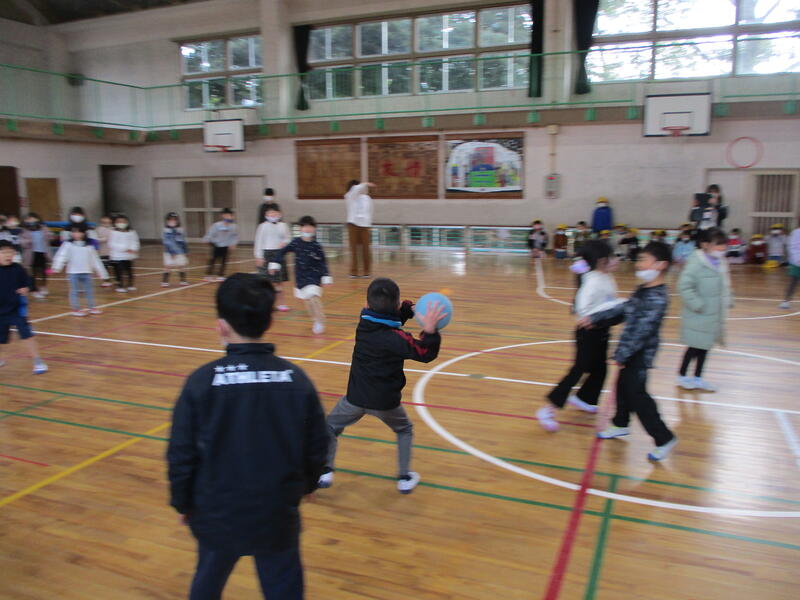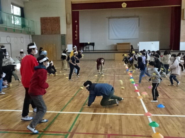 節分にちなんで、1年生と6年生が合同で豆まきを行いました。1年生が作成した鬼を面を6年生がかぶり、豆ではなく玉入れの玉を思いっきりぶつけていました。両者とも笑顔で活動し、とても楽しい時間となりました。