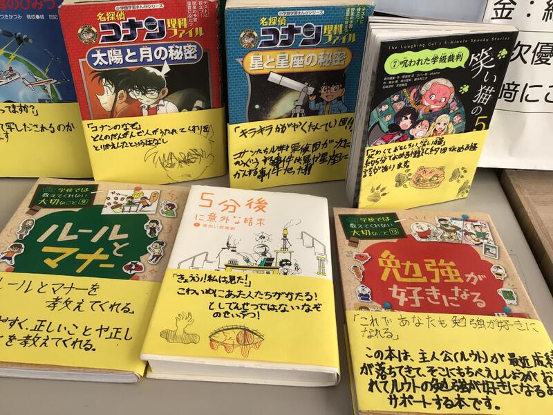 図書室に5年生が作成した本の帯が展示してありました。少しでも本に興味をもってほしいという願いが込められています。