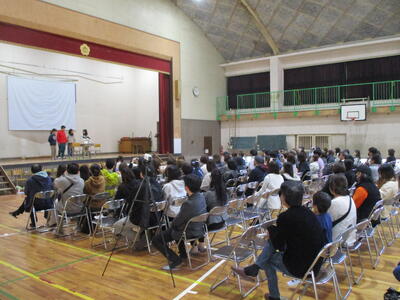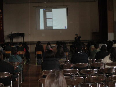 さて、本日冬休み前集会を行いました。校長先生、生徒指導担当、交通担当から、「やる気スイッチ」、「冬休みの過ごし方」、「交通安全のルール」について話がありました。