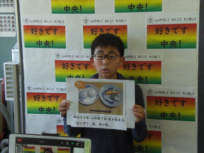 給食の時間に情報委員会による放送が行われました。本当のニュースのようにしている姿に大変感心しました。