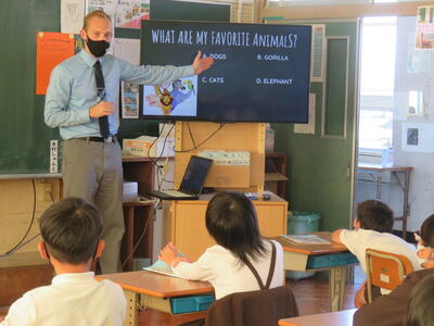 アメリカ出身のオースティン先生です。1時間目の前にZoomで全校児童にあいさつをしていただき、さっそく3~6年の授業に1時間ずつ入っていただきました。