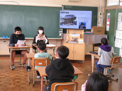 現地での説明の代わりに3時間目に縦割り班でそれぞれの教室に集まり、6年生が事前に作ったプレゼンテーション資料を見せながら、下級生に地域の史跡等を紹介しました。下級生にも興味をもって話を聞いてもらえるように、クイズを交えるなど工夫していました。