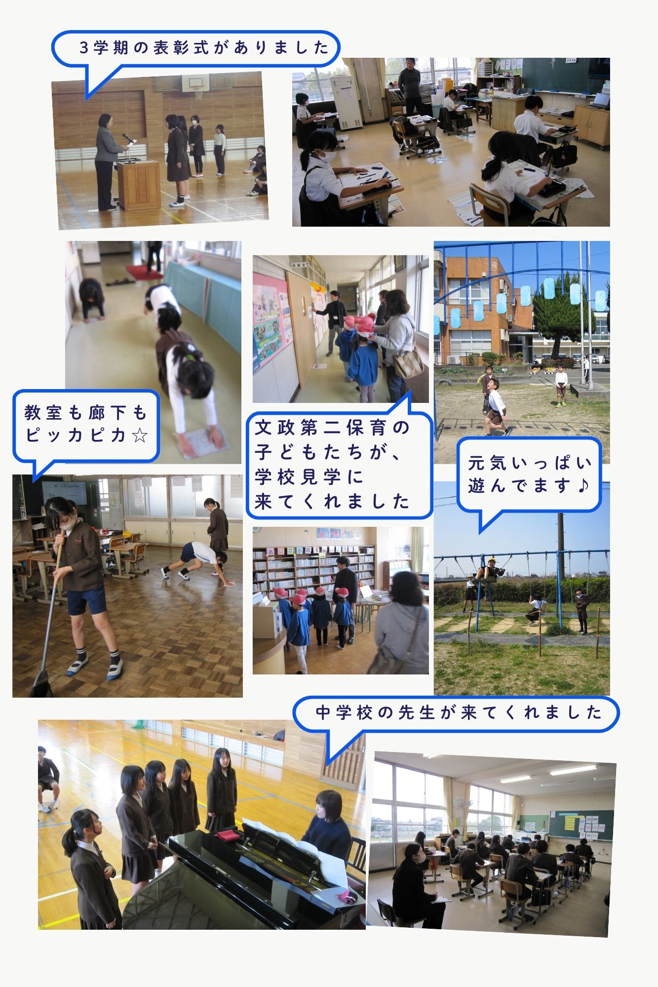 ありさっこのくらし 全ての記事 全ての記事 カテゴリ アーカイブ 2026年4月 (3) 2026年3月 (6) 2026年2月 (3) 2026年1月 (5) 2025年12月 (5) 2025年11月 (5) 2025年10月 (5) 2025年9月 (4) 2025年8月 (1) 2025年7月 (2) 2025年6月 (4) 2025年5月 (1) 2025年4月 (3) 2025年3月 (3) 2025年2月 (8) 2025年1月 (3) 2024年12月 (4) 2024年11月 (0) 2024年10月 (4) 2024年9月 (8) 2024年8月 (3) 2024年7月 (7) 1件 1件 5件 10件 20件 50件 100件 あと3日です! 投稿日時 : 03/18 学校サイト管理者 3学期も、学習の成果を表彰される児童がたくさん!名前だけ紹介の児童もいましたが、1年生も元気な返事をして立つことができました。また、文政第二保育園から1名だけ本校に入学してくる園児がいるということで、その子のために、みんなで本校を見学に来られました。あいさつの声や見学中の態度など、好感の持てるかわいらしいものでした。素晴らしい取組だと感じました。その他にも、6年生の授業に鏡中学校よりゲストティーチャーや授業視察をお迎えしたりして、残された小学校での時間を大切にしながら過ごした子供たちです。 0 {{options.likeCount}} {{options.likeCount}} « 2345678910 »