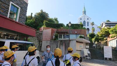 2日目の最初の見学地は、国宝大浦天主堂とグラバー園です。工事中のため残念ながら中には入れませんでしたが、高台からきれいな港の風景を眺めることができました。