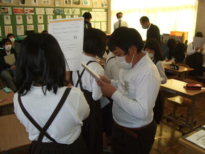 現地での説明の代わりに3時間目に縦割り班でそれぞれの教室に集まり、6年生が事前に作ったプレゼンテーション資料を見せながら、下級生に地域の史跡等を紹介しました。下級生にも興味をもって話を聞いてもらえるように、クイズを交えるなど工夫していました。