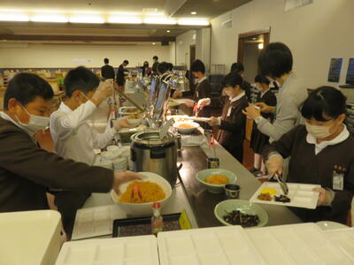 でも、朝ご飯はしっかりと食べていました。朝もバイキングだったので、自分が食べたいものを思い思いに選んでいました。中には「五島うどん」を何杯もおかわりして食べている子も…