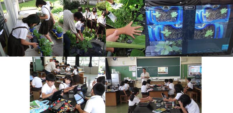 本日(7/3)2時間目、タブレットを持って靴箱にいる3年生を発見。ついて行くと、理科の授業中で、みんなそれぞれ観察記録を撮影していました。本時のめあては、「植物の体は、どのような部分からできているか調べよう」。上手にタブレットで撮影し、ホウセンカとヒマワリを並べて表示して、葉の形や大きさ等の違いや同じところに色々気付いて発表する3年生。タブレットを使いこなしています。