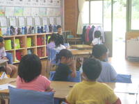 講師は役場の方々で、最初に紙芝居を使って、わかりやすく説明していただきました。水辺で安全に遊ぶために必要なことや溺れている人を見つけた時の対応の仕方、水に落ちてしまった時の対処法等を学びました。