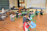 ①2年生の歌 ②わたしたちの村のすてき発表 ③こぐまの二月合奏という内容でした。「2年生の歌」は音楽の時間に歌った曲の中から子どもたちに一番人気があった「あのね、あのね、のねずみは」をみんなで話し合い、自分たち2年生のことに歌詞を替えました。所々にジェスチャーをいれてとてもかわいく歌いました。次の「わたしたちの村のすてき」では学校探険や見学旅行で見つけた南阿蘇村のすてきだなと思ったところについて班ごとに発表しました。最後は、いろいろな楽器を使って合奏をしました。