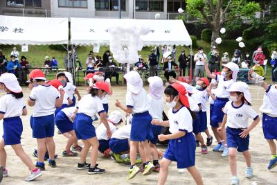 5.6年生がオープニングセレモニーで風船を飛ばしました。