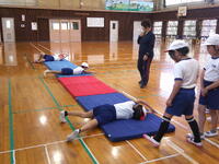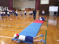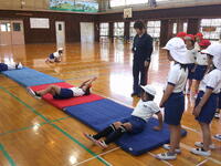 今回の学習は、マット運動です。いろいろな動きがありますが、体をまっすぐ伸ばしてコロコロと転がる運動を行っているところでした。簡単そうに見えて、実はなかなか難しいんです。転がっているうちに、マットからずれていってしまうんです。でも、2年生はみんな上手にコロコロできていました。