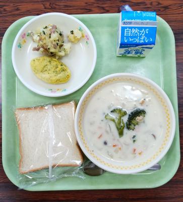 今日の献立は、牛乳、食パン、オムレツ、ジャーマンポテト、クリームシチューでした。