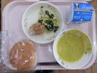 ★丸パン ★さつまいものポタージュ ★フライドチキン ★ほうれんそうとコーンのサラダ ★牛乳 です。