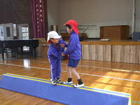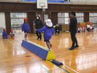 次に、平均台を使った陣取りが行われました。各学年、少しずつ場が異なります。学年が上がるにつれ、難易度も高くなります。