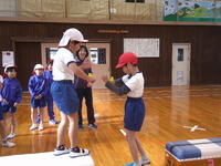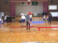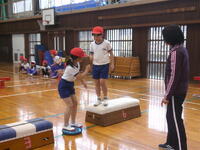 最後には、全学年、少しずつ難易度をアップ!1年生は半円柱のマットを逆さに、2年生はラケットの上にアヒルちゃんを乗せ、3年生は手の甲にアヒルちゃんを乗せて、スタート~!