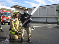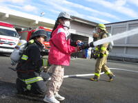 お話を聞いた後は、放水体験もさせていただきました。水圧が強いので、しっかり力を入れて持たなければなりません。
