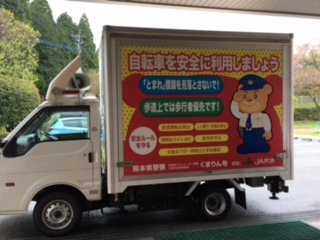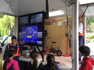 高学年の交通教室には、熊本県に1台しかない『自転車シュミレーター搭載 交通安全教育車両 くまりん号』が登場しました。