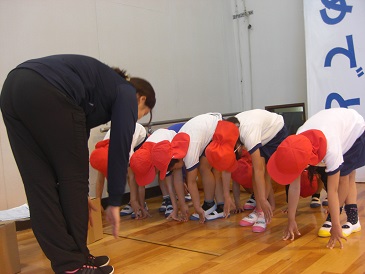 ↑ 長座体前屈(柔軟性の検査)の準備運動中です。