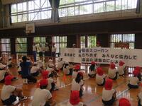 本日から、運動会の全体練習が始まりました。体育主任と校長から、運動会に向けてどのような思いや態度で臨むのかを伝えたあと、運営委員会から今年のスローガンについて発表がありました。今年のスローガンは、「最後まであきらめず、みんなと協力して、最高の運動会にしよう」です。運動会練習期間中、常にこのスローガンを意識して行動できるよう、玄関のみんながよく見える場所に設置します。このスローガンのもと、全校みんなで盛り上がっていきましょう!