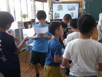 1階のオープンスペースから、がまくんとかえるくんの会話が聞こえてきました。行ってみると、2年生の子供たちが「お手紙」の音読練習をしていました。3つの班に分かれての活動です。