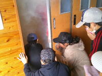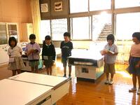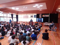 消防士さんのお話の後、5・6年の代表児童が消火訓練も行いました。「火事だ!」と大きな声で周囲に知らせ、「ピノキオ」の合言葉どおり、落ち着いて消火活動を行うことができました。