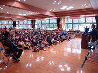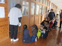 低学年のテラスに不審な人物が現れたという想定で、訓練を行いました。警察の方からは、「子供たちは静かに落ち着いて避難場所にに移動できていました」とお褒めの言葉をいただきました。担任の先生からの事前指導がきちんとなされていたからだと思います。