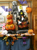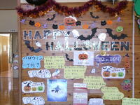 本日は、ハロウィンですね。校内には、イングリッシュコーナーに「ハロウィンとは何?」と、ハロウィンに関する掲示がされています。また、玄関にもジャック・オー・ランタンなどが飾られにぎやかです。