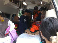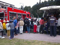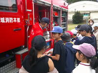 その後、煙体験と消防車・救急車見学を行いました。煙体験では、できるだけ身を低くし、煙を吸い込まないよう気を付けながら進んでいきました。消防車や救急車の設備について説明を受けながら、色々なことに興味津々の様子でした。