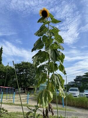 1年教室の横の花だんに、大きなヒマワリが咲いています。